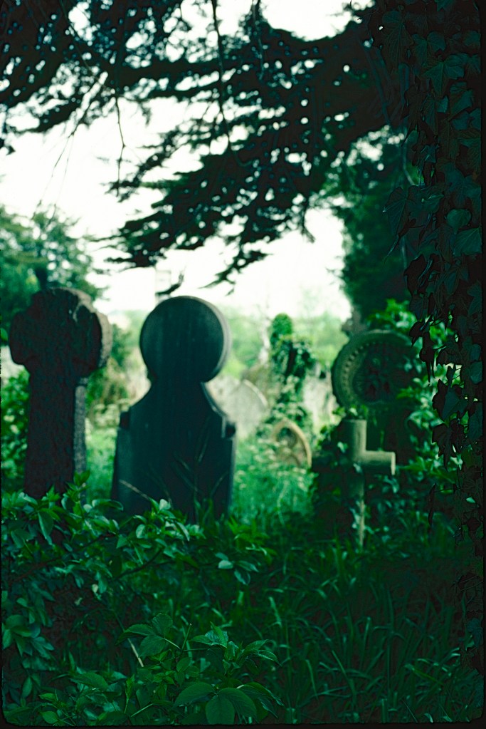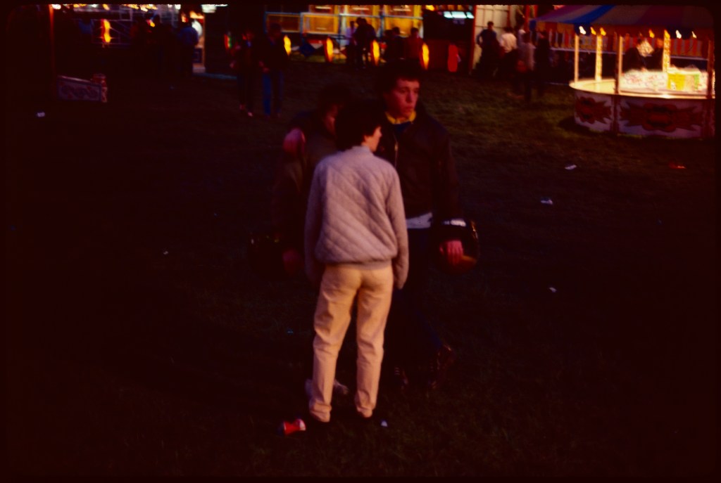 In a short essay written in 2014, I expressed some doubts about the digital generation’s enthusiasm for analogue qualities and errors. But in looking back on this catalogue of my own errors, some of them seem telling of more than my incompetence: the image of the Mayakovsky show, to start with the easiest one in which to unearth some subterranean virtue, may be visually horrible but at least it exists: I cannot find other images of the exhibition as installed online (though presumably they reside somewhere in the archives of what is now Modern Art Oxford). More generally there may be seen an affinity, perhaps a sentimental one, between analogue faults and the frailties exposed by time: of the sun making darkness visible on a certain moment forty years ago; or of Spring leaves picked out in isolated sharpness in a graveyard around the same time. If the people are dominated by garish signs in Oxford’s shopping district, that too still carries a charge into the present, although the look cast back at the camera by a man in a cap, standing as if spot-lit amidst the deep shadows, suggests alertness beyond the consumer pursuit. Finally the blurry youths at the night-time fair appear now as retrospective symbols of transience and precarity, material and temporal.