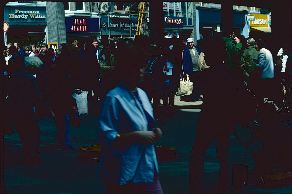 It takes a great deal of skill to use Kodachrome for street and documentary photography (I would later come to appreciate Larry Burrows, Raghubir Singh and Susan Meiselas, among others, for just that skill) and I certainly did not have it. This was a scene near the Westgate shopping centre in Oxford in which again I have underexposed, not realised how narrow the depth of focus would be, how the shop signs would glare out as the brightest elements in full sun, or how the walking figure closest to the camera would become blurred.