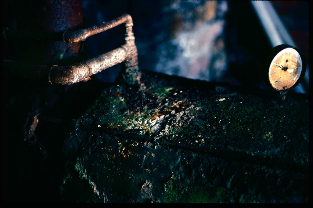 With its spectrum of aged and weathered surfaces, and when inside the low and uneven light, as rays cut through broken, blackened windows and holes in the roof, it also offered a photographic training ground. Slow film met darkness, abrupt contrasts in illumination, and an interplay of the remaining organisational and productive order of the place as it collided with erosion, destruction and the ingress of plants and birds. It only occurred to me later that, in this place, I learned various photographic and political ABCs.