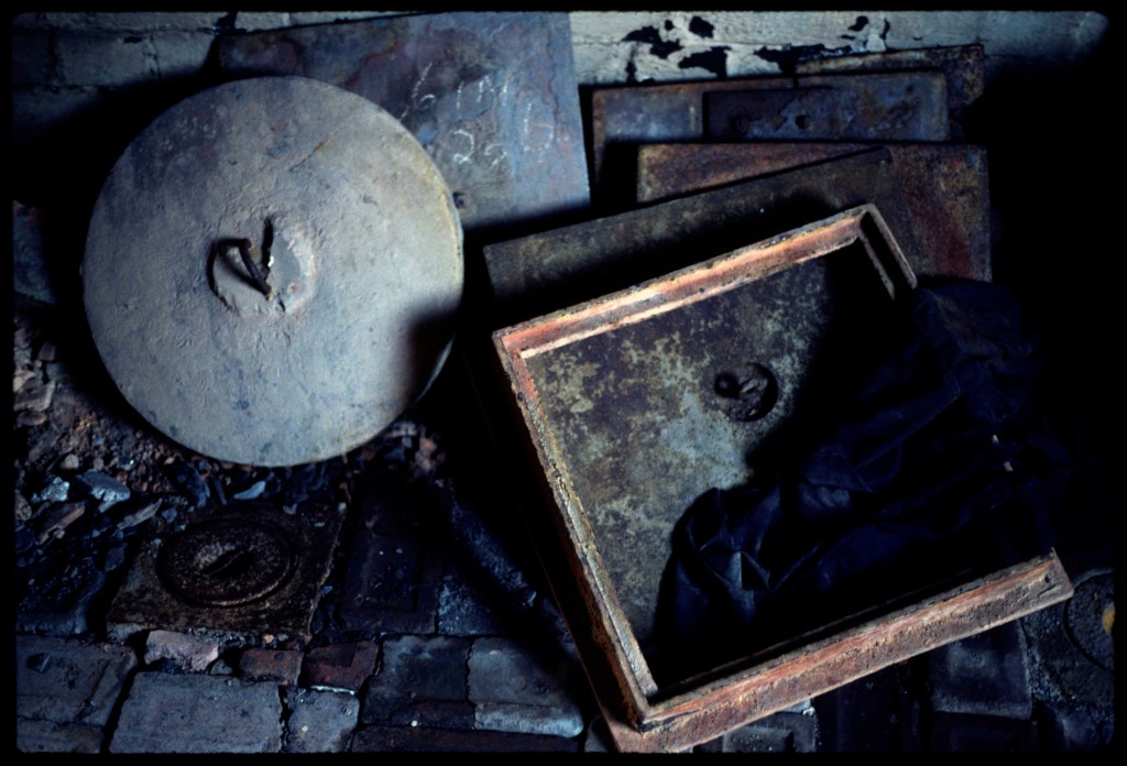 Often I photographed there hand-held, wanting mobility and a quick means of escape, and with slow film and low light, blur crept into some images. Once, though, I went to the factory with a tripod, and was photographing in its main hall when faintly then louder, I heard a woman’s voice, crying out for help. I left the camera and went towards the sound—outside, up some decaying steps, closer and closer until I reached a corner of the building, and knew that around it I would find whatever awaited. I had picked up a heavy metal pipe as a weapon; I could hear a man’s voice now, and hers still crying, begging him to stop. I then thought that if I turned the corner, pipe in hand, there would certainly be violence, so I laid it down in the hope of talking.