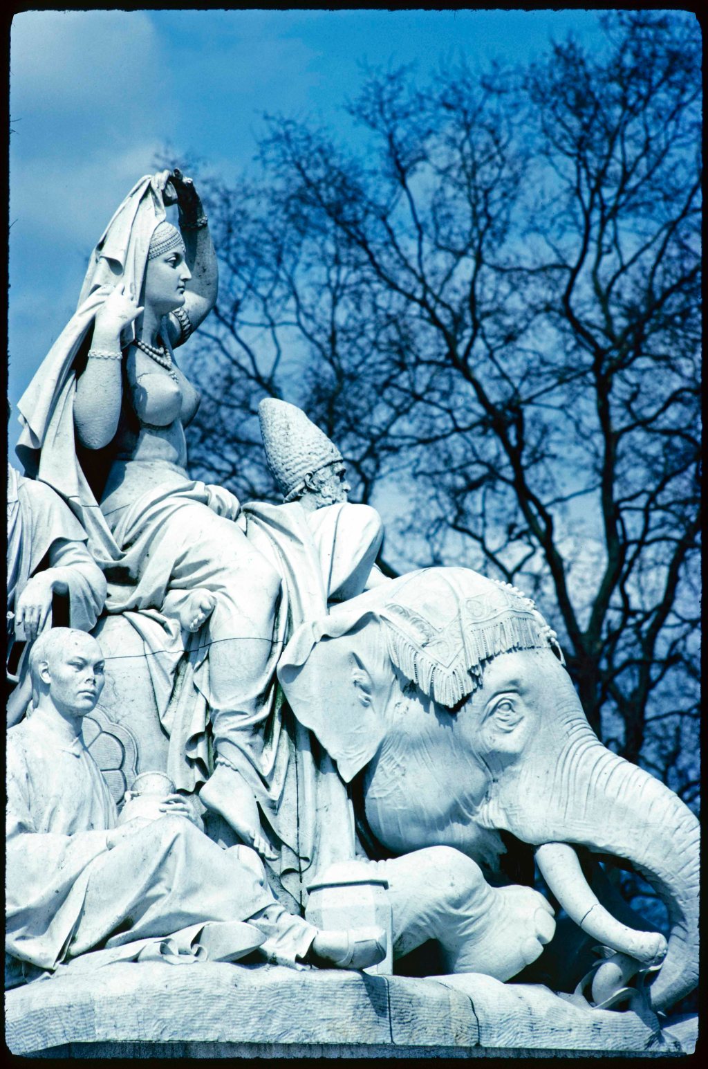 I remember photographing the Albert Memorial on a clear spring day, fascinated and horrified by that assemblage of confidently imperial Victorian kitsch with the gilded presence of the universal ‘Renaissance Prince’ seated at its centre. If the monument is an ode to expense and excess, it reflected the fawning deference with which Albert was viewed, at least among those wanting to court the Queen: the ‘enthroned effigy’, as the Memorial’s designer put it, had only the Cross above him while Homer, Shakespeare, Dante and other luminaries paraded below. The element in the photograph, sculpted in marble by John Foley, represents Asia. The continent’s avatar (naturally seated on an Indian elephant so that viewers know exactly where to place their minds) unclothes herself for the eyes and prurient imaginations of passersby. The other figures are equally cliched—a potter is seen sitting beside the elephant, for example.