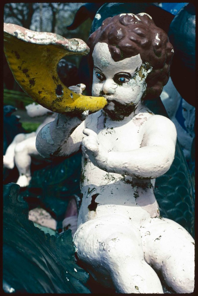 In Aberdare, the mining town where I was working, I photographed in its park, a typical Victorian amenity with a boating lake. It also contained a very strange fountain, although the only water that ran through it at that time was the persistent valley rain. Its scale, proportions, figures, decoration and material all seemed uncannily dislocated. It had at some point been gaudily and crudely painted, and that paint was now flaking off.