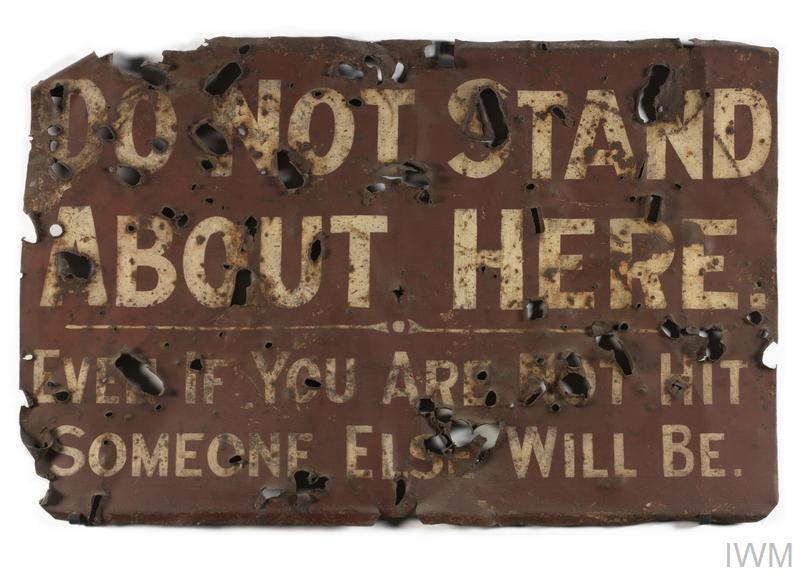 Later it made me remember a moment which simultaneously fills me with a certain shame and a sense of wonder at the tricks feelings play; I was standing in the basement of the Imperial War Museum, with a woman I was half in love with, and about whose attitude to me I was still uncertain. We were looking at the metal signs taken from First World War battlefields. What poignancy they had—all those familiar names from London and other towns, mapped over that unearthly and unprecedented landscape, and how many projectiles had pierced them. There was one I noticed in particular; it was hard to make out the writing, so punctured was it: