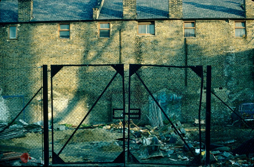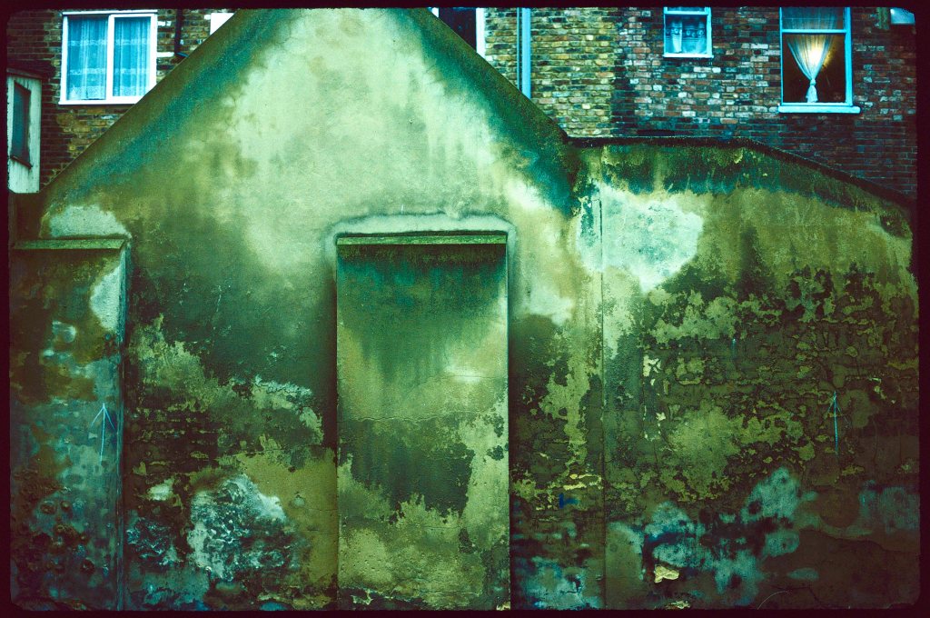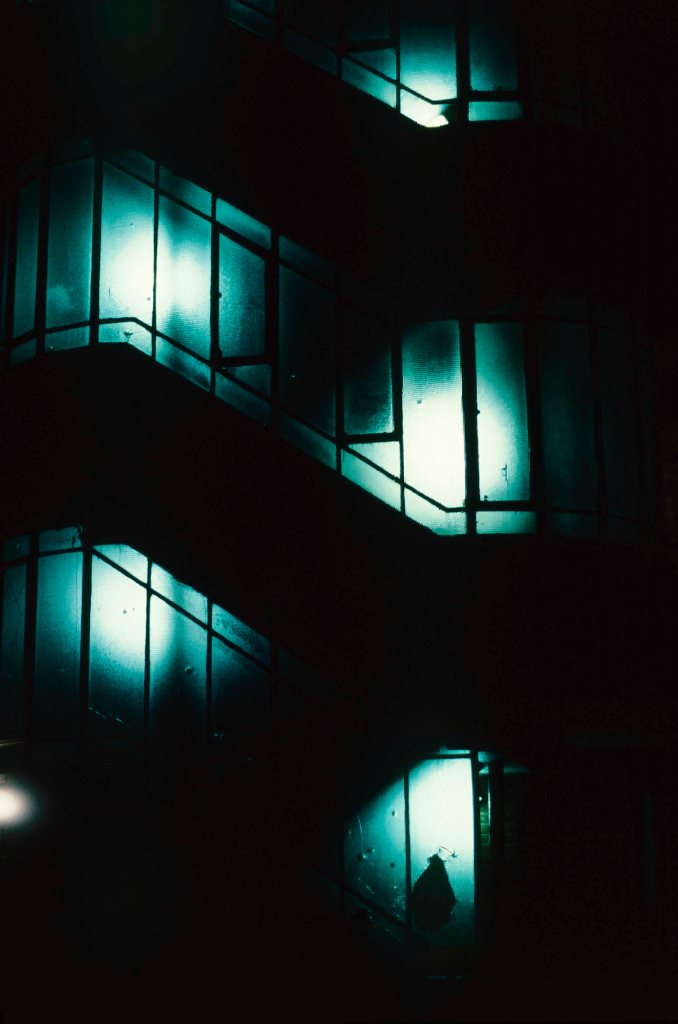 Almost all of these photographs were failures, although gradually I learned how the meter behaved in such conditions, and how to expose for the highlights. In this image of a council-block staircase, the lights were tungsten, so they were rendered without a colour cast. It may say something about the intimidating character of those run-down estates at night.