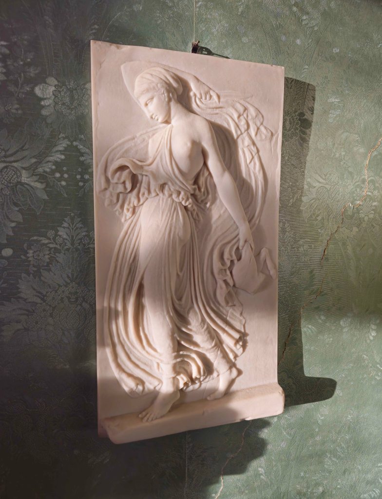 Forty years ago this month, at dusk, I took a blurry and oddly tinted photograph of this relief, which was then new, and that has hung in its place ever since; a few days ago, I photographed it again, as you see here. A once-popular British Museum replica, my father had bought it because he found the woman and drapery beautiful. He had not looked at it very carefully, though, missing her dagger, and not wondering about the hindquarters of a goat that she trails behind her: a follower of Bacchus, a Maenad, she dances in the wake of a frenzy during which she has torn wild animals to pieces. When I first told him this, my father said that I had spoiled the piece for him, yet there it remained, as the house and its inhabitants aged around it.