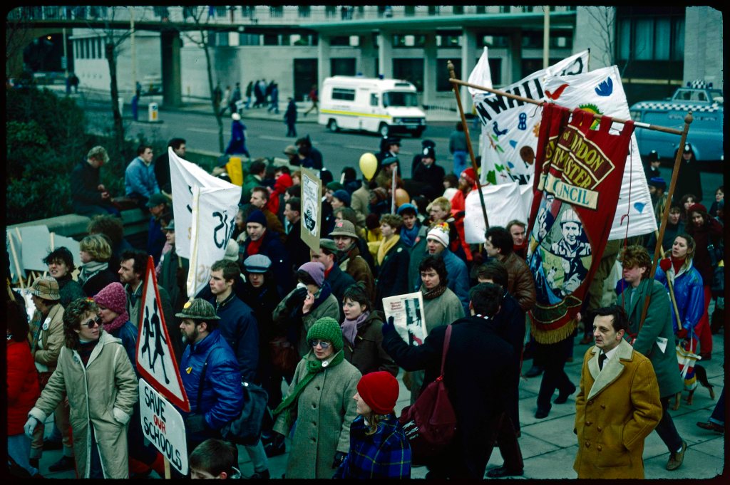 Even after nearly two years of regular picture-taking, I was too shy and unsure of my abilities to take street photographs of people, except in those circumstances, such as demonstrations, where I felt that I had some implicit permission to photograph—as at this protest against the abolition of the Greater London Council. (The Tories hated the left-wing city government and amply demonstrated their contempt for democracy when it delivered the ‘wrong results’ by simply abolishing it, leaving the capital without a democratic governing body for over a decade.) I used the Leica instead with static subjects.