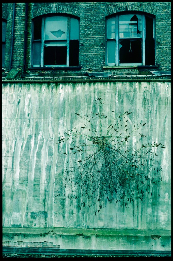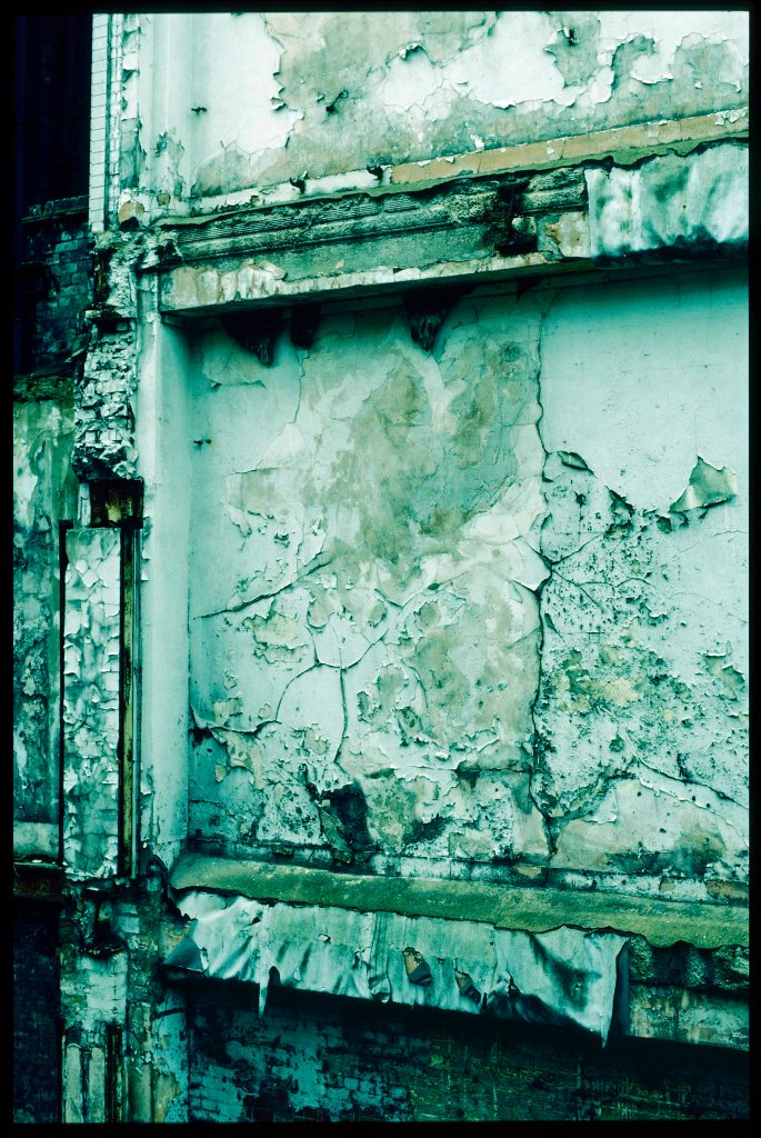 On another, below windows broken by vandals, vertical marks, a little reminiscent of abstract painting in the manner of Morris Louis, had been left in the grime by rain, and arcs had been scratched into the plaster as the wind blew against the plant that sprang from it. The photograph shows a mix of appearances caused by intentional destruction and the consequences of neglect, each indicating a different form of deliberation, the first motivated by the pleasure of breaking things, the second, most likely, by the lure of future profit.