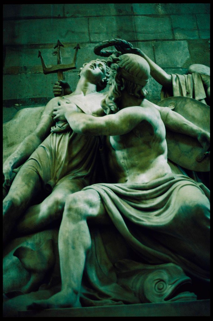 The other is to Captain Robert Faulknor, killed in 1795 during a naval battle with the French in which his brave and innovative tactics assured victory. Given such a martyrdom to Empire, of which British propagandists in marble and paint were overly fond, Rossi contorts his figures to convey the emotions meant to accompany the tragedy. The young warrior, still armed with broken sword and shield, is borne up by Neptune amid the waves, while once again Nike brings her crown.