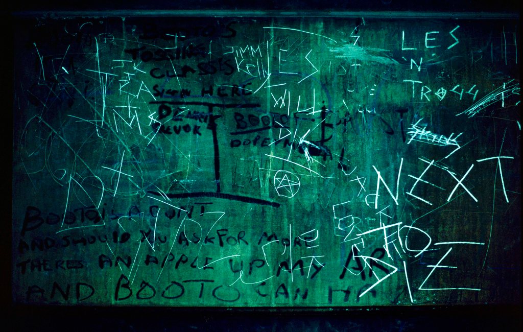 In Abney Park Cemetery, inside the crypt of a very wealthy family, the tombs had been defaced. As in Civil War iconoclasm, pleasure is taken in destruction and the violation of the once-powerful and the once-sacred. As in St Mary Redcliffe, light struggles out of the darkness to reach the lens as the limits of the film, when the camera is hand-held, are approached. And once again—in contrast to marble forms seen under the stately, even light of high windows—the shades gather, the presences of those who do not leave official marks and resort to the demotic and the obscene.
