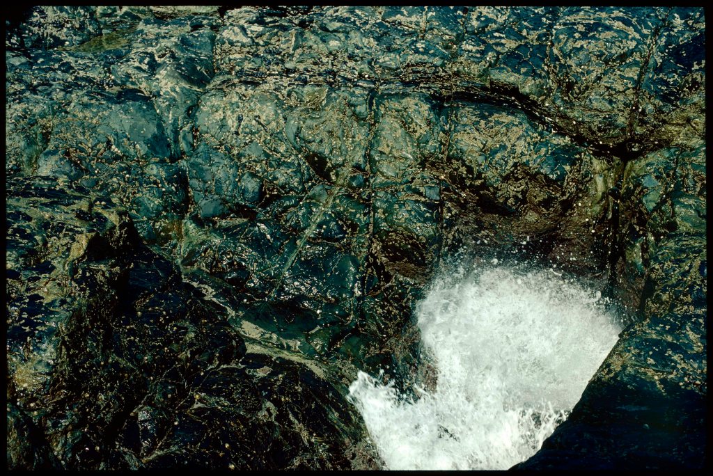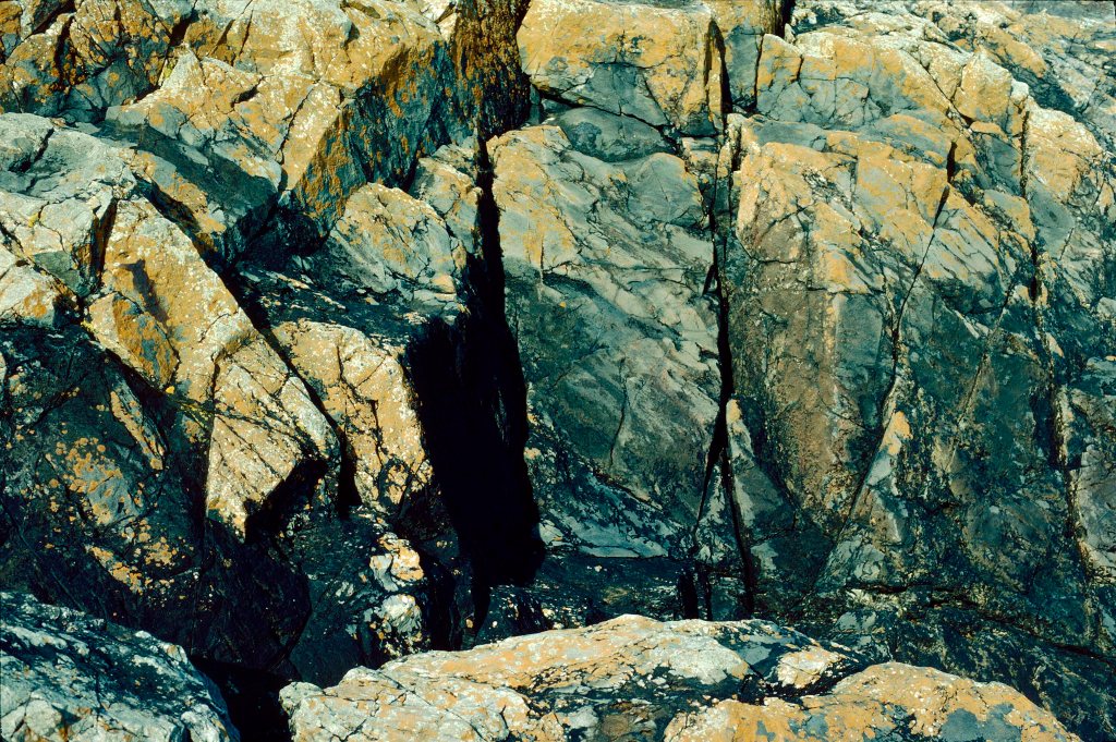 Our long summers, over years in which we repeated those same activities, were collated in the mind in a fusion of colour, temperature, roughness and smoothness, and the intense surveillance of rockpools for signs of life. A few distinct memories stand out—the brief horror of seeing my brother leap over a wide and deep crevasse which would surely have broken bones if he had fallen; the rare journey far out across the rocks to a place we called ‘hell’s mouth’, which formed a stony frame to a window onto the open sea. Colour and shape were among the qualities that were over the succession of time woven deep into our developing minds, patterned there as we tested our growing bodies against the demands of traversing the rocks.
