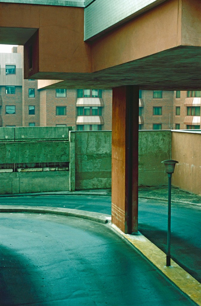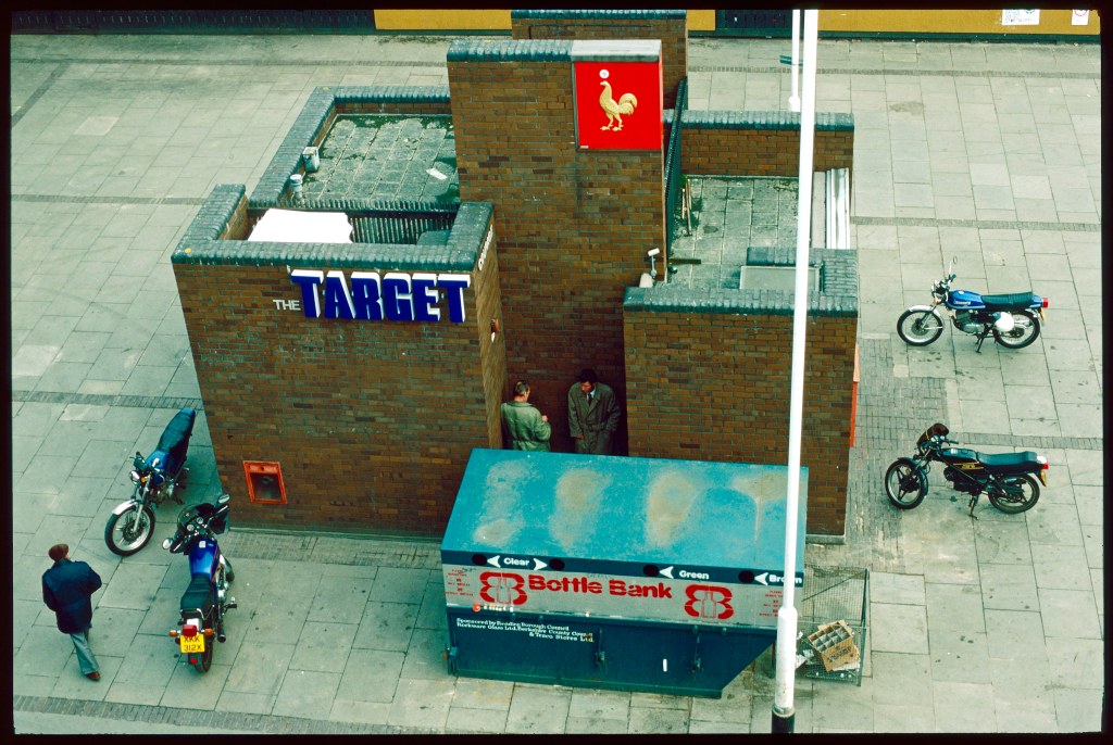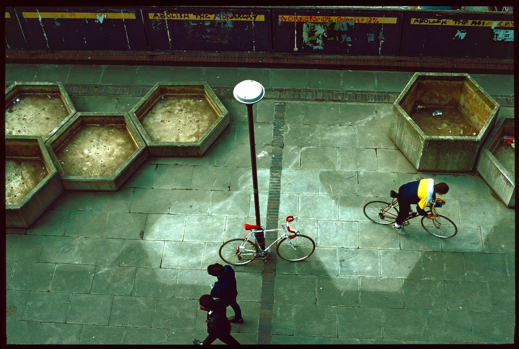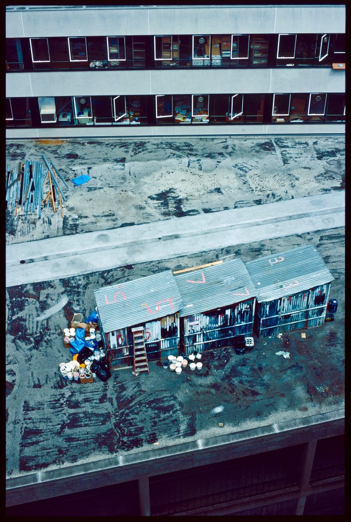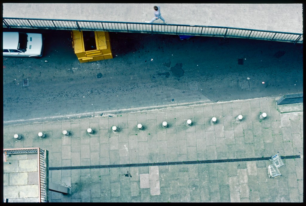 I have not looked at these images since they were taken. My response to the difficulty was to often shoot from above (from the roof of the Butts shopping centre, among other places) and to lean upon a strict compositional geometry—to use the means of modernism to depict the shabby and alienating environment of its remains.
