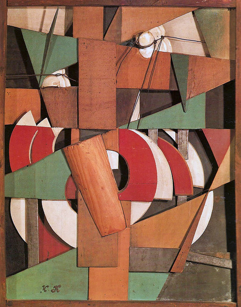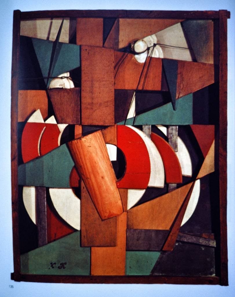 Among these illustrations that I remember photographing on Kodachrome 25 by a window that let in dull December daylight, is this construction by Ivan Kliun, Landscape Rushing By. In a composition that fuses Cubism and Futurism, Kliun uses wooden pieces alongside porcelain and wire fragments taken from telegraph poles. The subject—the landscape seen at speed, from a train or car—was typical of Futurism. In Russia (as in Italy) where modern industry had a weak and highly localised hold, such a celebration of the perceptual novelties of speed seemed to offer radical possibilities. It would have had, for some viewers at least, a neophiliac allure in that massive, backwards nation which had been driven by its Tsarist masters into the modern world (at least in discrete areas of a few major cities), and then forced into a catastrophic modern war. Wood is used for telegraph poles, sure, but here the way in which that ancient material has been cut up into geometric elements, suggests the discomposing and recomposing of the landscape into a new and as yet unknowable order. At that moment—and into the early Soviet period with its propaganda trains and free pleasure flights given to incredulous peasants—such experiences were seen as incubators of transformative ways of perceiving the world. Wyndham Lewis’ jibe at the Futurists’ childish excitement over mechanical inventions (above all, the automobile) comes to mind: ‘[…] England practically invented this civilization that Signor Marinetti has come to preach to us about. While Italy was still a Borgia-haunted swamp of intrigue, England was buckling on the brilliant and electric armour of the modern world […].’[2]