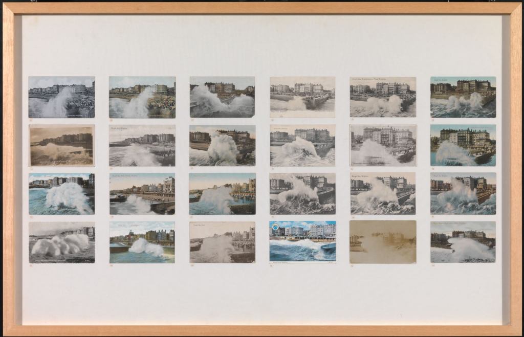 Years later, I saw a work by Susan Hiller, hanging in a seminar room at the Courtauld Institute, in which she had arranged postcards in a grid, each with the caption ‘A Rough Sea’. Hiller, born in the US and trained in anthropology, viewed the cultural habits of the British with a detached, wry humour, and here cast her eye on the miniaturised tourist sublime. The force of the sea, already shrunken, framed and composed—and perhaps made kitsch—was further tamed by typological repetition. Yet there is a two-way process here, as indicated in Hiller’s title, in which the singular moments of photographic capture are placed in a series to highlight their uniformity, while the artistry contained in each is recognised and even elevated. The renditions and the sentiments that they are meant to arouse may be standardised and commercialised, and also point to the contemporary fading and fraying of the sublime as explored so acutely by Sianne Ngai, but they do also take artistry to make, and may have exposed their artists to risk, and may point beyond their transactional character to forces far beyond human control.