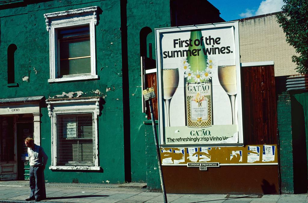 Opening onto the wider street, adverts mocked the human and physical dereliction around them. This one parasitically fed off a well-known sitcom of the time, Last of the Summer Wine, in which three elderly characters found solace in their companionship as they rambled about the Yorkshire countryside. Old age here is less appealing, in the shabby figure that steadies himself on a bollard, and in this the marketing of alcohol may well have played its part.