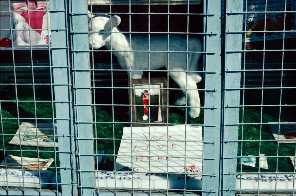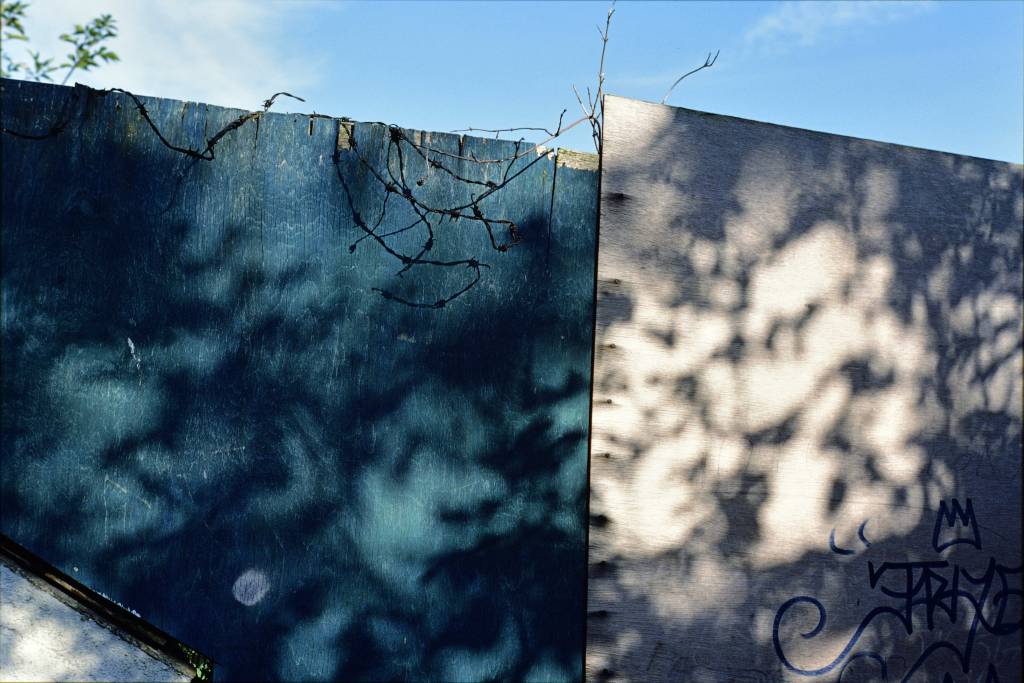 The look of those improvised barriers in the autumn sun, marked by writing and weathering alike, had an affinity with photographic recording on film, which is also the marking (by light) of a surface. In a meeting of shadow and writing, the sun casts on a hoarding the cursive script of barbed wire, echoing the graffiti below. Perhaps, since at night a street lamp may have cast similar shadows, that echo was a deliberate artistic choice. Among such decay and neglect, trespass temporarily produced common spaces, which opened opportunities for social connection, destruction and creative expression, as well as violence and theft.