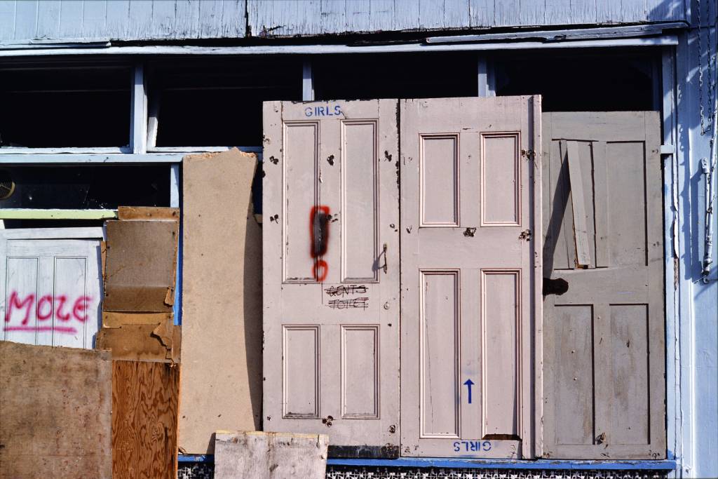 In dereliction and social disaffection, the barriers that so demarcate and form the capitalist environment—walls, railings, gates, fences and security grilles—were often makeshift and flimsy, as vacant properties were defended to meet the distant day when they would once again become valuable. Often broken into for the free and private satisfaction of various bodily urges, their facades were covered in scatological and sexualized scrawling.