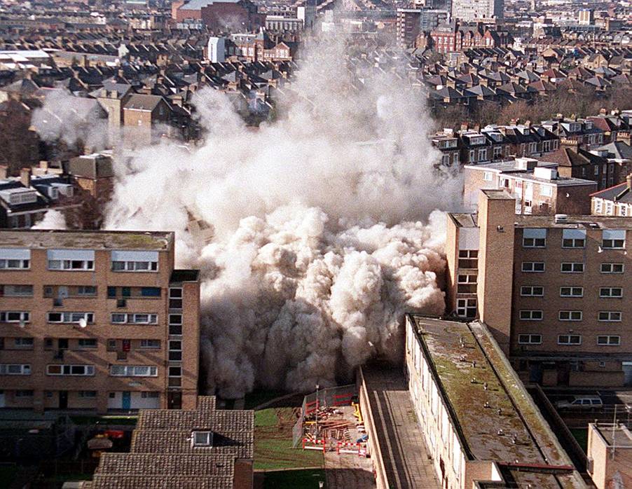 In another narrative—which has at least some justification, as we have seen—the buildings themselves were blamed for the social ills that pooled within them. In 2000, a great public spectacle was laid on at King’s Crescent Estate, in which they were ‘solved’ by using dynamite to fell the block in a colossal cloud of dust and debris.